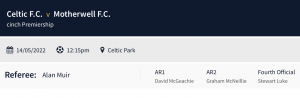 The Scottish Football Association have confirmed that Alan Muir will be the referee for today’s game between Celtic and Motherwell. Celtic have already sealed the league title but there are still three points to play for as Graham Alexander’s side arrives at Paradise for a day of festivities.