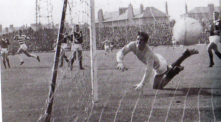 Joe McBride scoring in the semi-final against Hibs at Ibrox