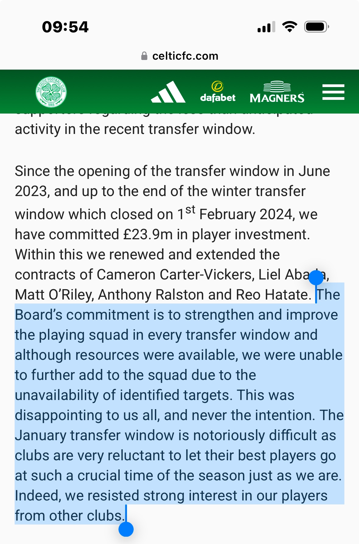 The Celtic Board failed to deliver in this window, they need to deliver in the next one, there is simply no excuse. If they don’t then relations between them and the supporters, and indeed the manager will become even more strained. Here’s a reminder of what they told us this time last year…