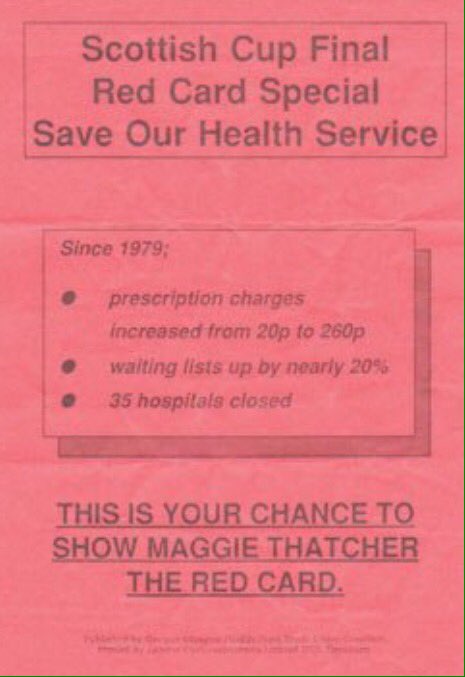 Before the game both sets of supporters held up red cards in protest at the presence of conservative Prime Minister Margaret Thatcher who would be handing over the trophy to the winning side. To say Thatcher was unpopular in Scotland at the time was an understatement and rightly so, so her mere presence was met with unsurprising criticism.