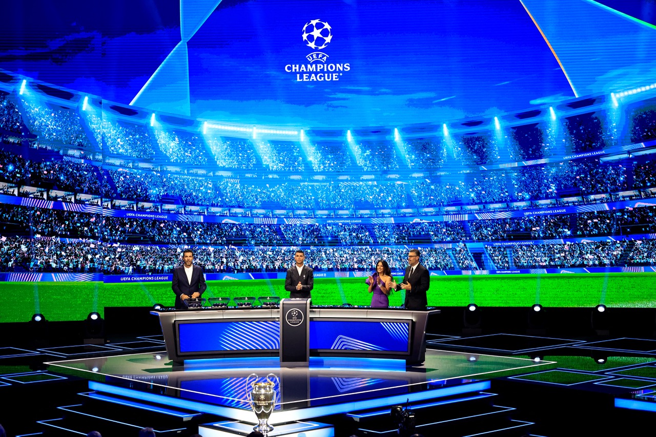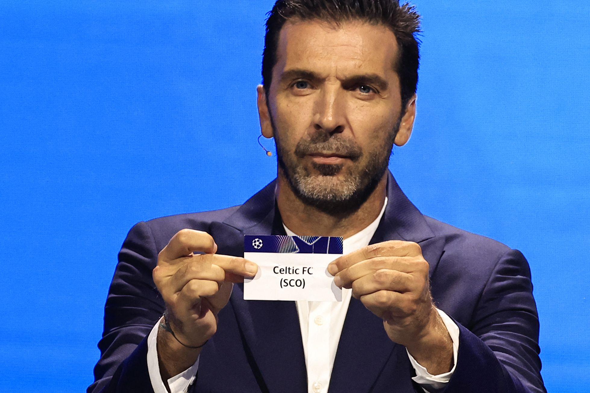 Italy’s former goalkeeper Gianluigi Buffon shows the paper slip of Celtic (SCO) during the group stage of the 2024-2025 UEFA Champions League football tournament, at the Grimaldi Forum in Monaco on August 29, 2024. (Photo by VALERY HACHE/AFP via Getty Images)