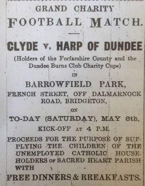 Undeterred, it was on a mid-May afternoon in 1886, that Brother Walfrid managed to get Harp of Dundee, one of approximately 40 Irish teams in Scotland at the time, to accept Clyde’s invitation of a charity match at their former home pitch – Barrowfield Park. Harp of Dundee stole the win with a late goal to make the score line 2-1 in their favour. This time the match’s fundraising success was resounding. All proceeds from the event went towards The Poor Children’s Dinner and Breakfast Tables. Therefore, it was fitting that both teams were invited to Sacred Heart School for a post match meal.