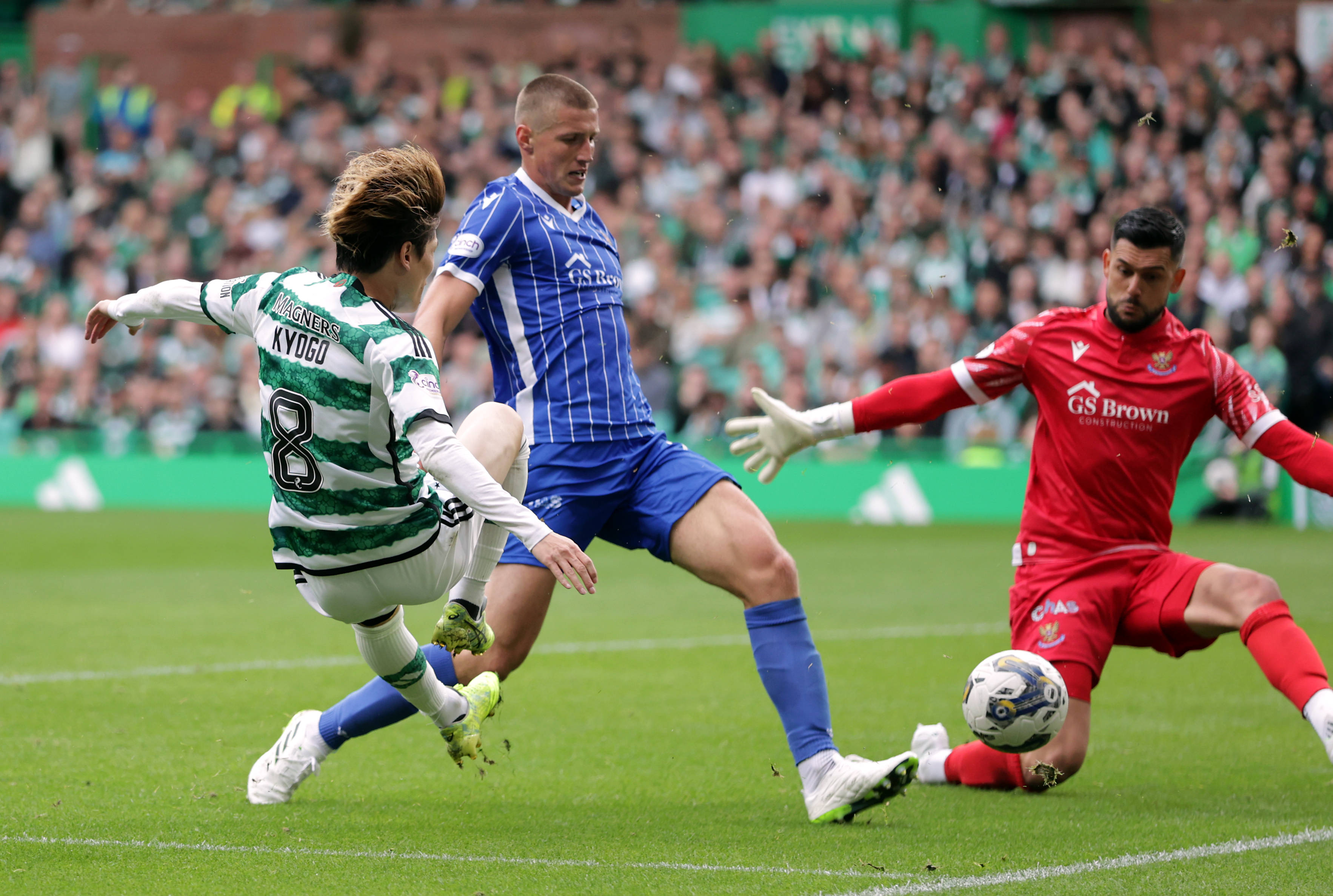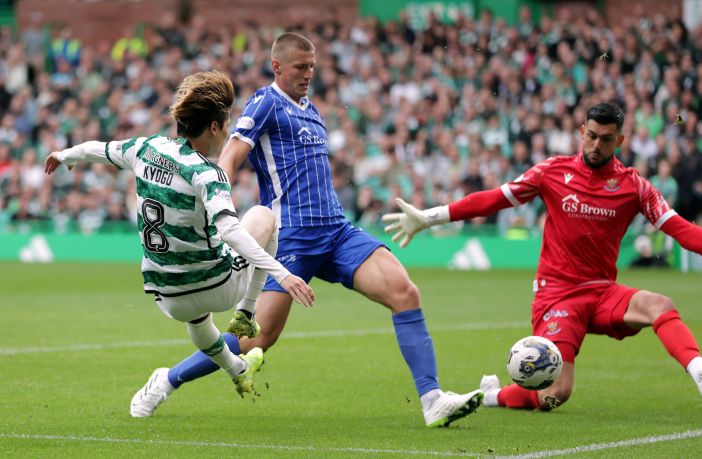 Celtic v St. Johnstone – Kyogo Furuhashi shoots during the cinch Premiership match at Celtic Park on Saturday August 26, 2023. Photo Steve Welsh