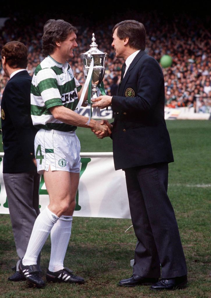 Photo imago/Colorsport Roy Aitken hands over the Scottish League Championship trophy to coach Billy McNeill. Celtic v Dunfermline 7/5/88.