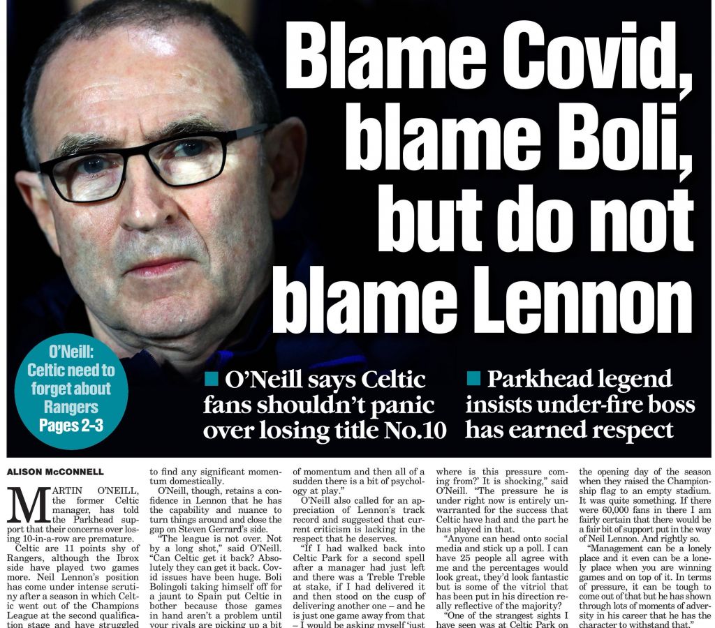 Now if you are a Coventry City supporter, or a Plymouth fan, or a Middlesbrough man, and you were watching Sky Sports the other night then you’d probably have been confused. Hadn’t Celtic won nine titles in a row, eleven trophies in a row and are in a Cup Final later in the month? Frankly it was a bad look from the outside looking in and a ‘reasonable man’ with no particular concern for who wins the Scottish Premiership in season 2020/21 could easily draw a  ‘sense of entitlement’ conclusion. And if they’re thinking that then a hack at the “Thugs and Thieves” Daily Record is going to state it too. If there is a chance to kick Celtic and the support it will always be taken. Thus the absolute madness of the Celtic media strategy.