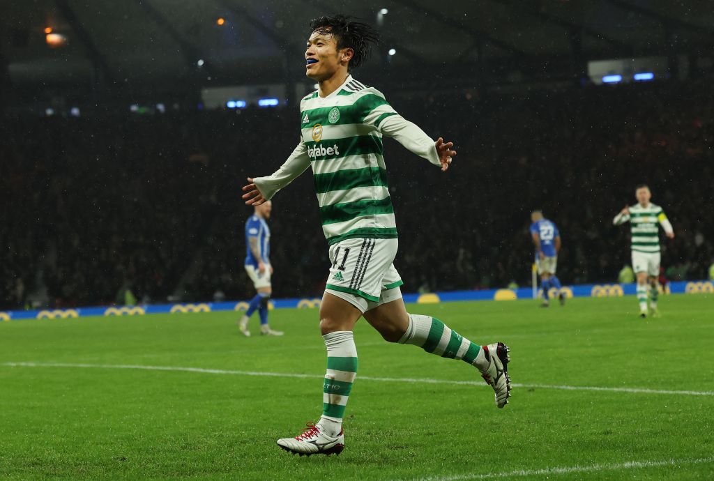 Reo Hatate of Celtic celebrates after scoring his team’s second goal which was then wrongly judged to be off side by ludge-VAR during the Viaplay Cup Semi-final match between Celtic and Kilmarnock at Hampden Park on January 14, 2023 . (Photo by Ian MacNicol/Getty Images)