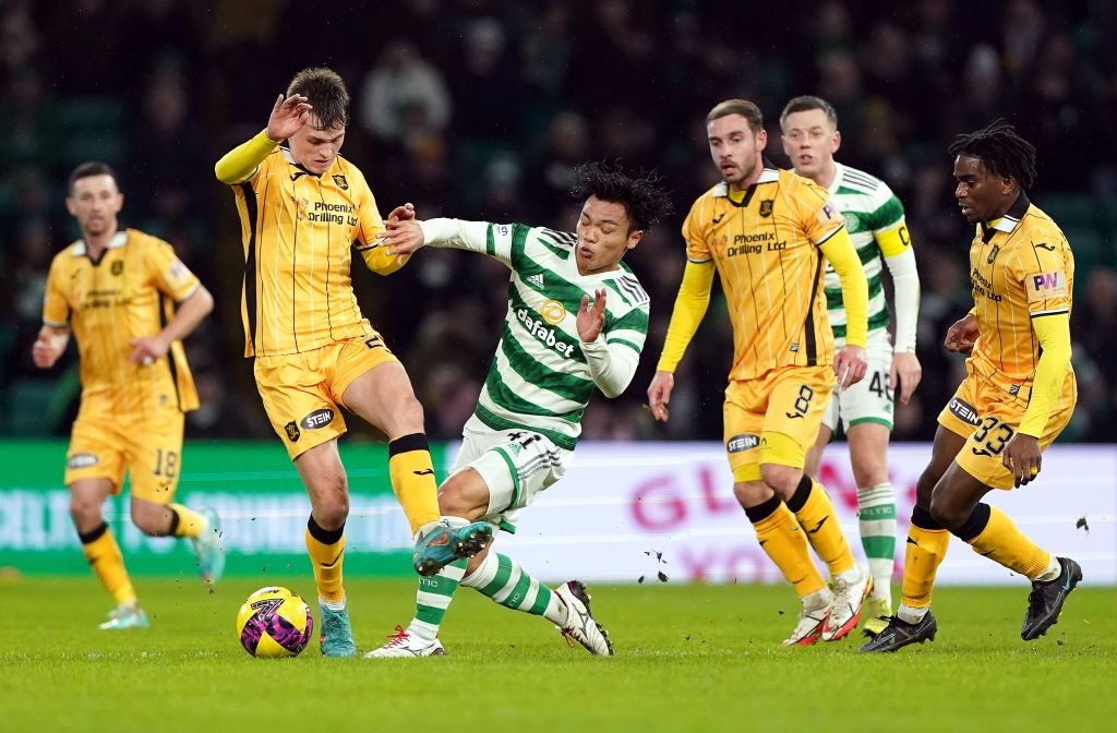Celtic v Livingston – Reo Hatate centre and Livingston’s James Penrice battle for the ball during the cinch Premiership match at Celtic Park, Wednesday February 1, 2023. Photo Andrew Milligan
