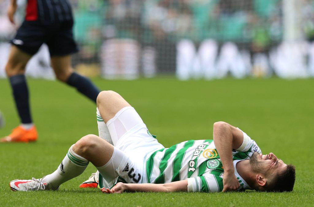 GLASGOW, SCOTLAND – SEPTEMBER 11: Greg Taylor of Celtic recieves treatment during the Cinch Scottish Premiership match between Celtic FC and Ross County FC at on September 11, 2021 in Glasgow, Scotland. (Photo by Ian MacNicol/Getty Images)