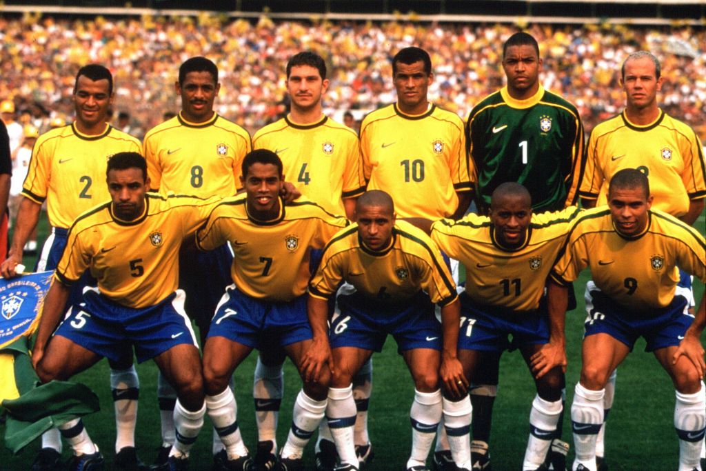 Photo: Stellan Danielsson Mannschaftsbild Brasilien, hinten v.li.: Cafu, Vampeta, Rafael Felipe Scheidt, Rivaldo, Torwart Dida, Antonio Carlos, vorn: Emerson, Ronaldinho, Roberto Carlos, Ze Roberto und Ronaldo; Nationalmannschaft, Nationalteam, Nationaltrikot, Raphael, Vneg, quer, Mannschaftsfoto, Torhüter, Keeper Copa America 1999.