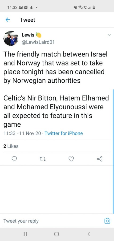 The Cynic’s reporter Lewis Laird reports on this: “The friendly match between Israel and Norway that was set to take place tonight has been cancelled by Norwegian authorities Celtic’s Nir Bitton, Hatem Elhamed and Mohamed Elyounoussi were all expected to feature in this game