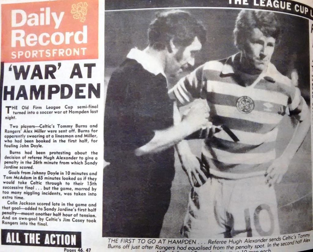 The 50,000 supporters inside Hampden, on a dreadful Wednesday night just before Christmas, witnessed a controversial match, with Celtic twice taking the lead then being pegged back, the second time with just ten minutes remaining. Rangers’ first goal had come from the spot after 26 minutes, with Tommy Burns sent off for protesting the award. Rangers were then reduced to ten men in the second half, as Alex Miller picked up a second booking and the tie moved into extra-time at 2-2.