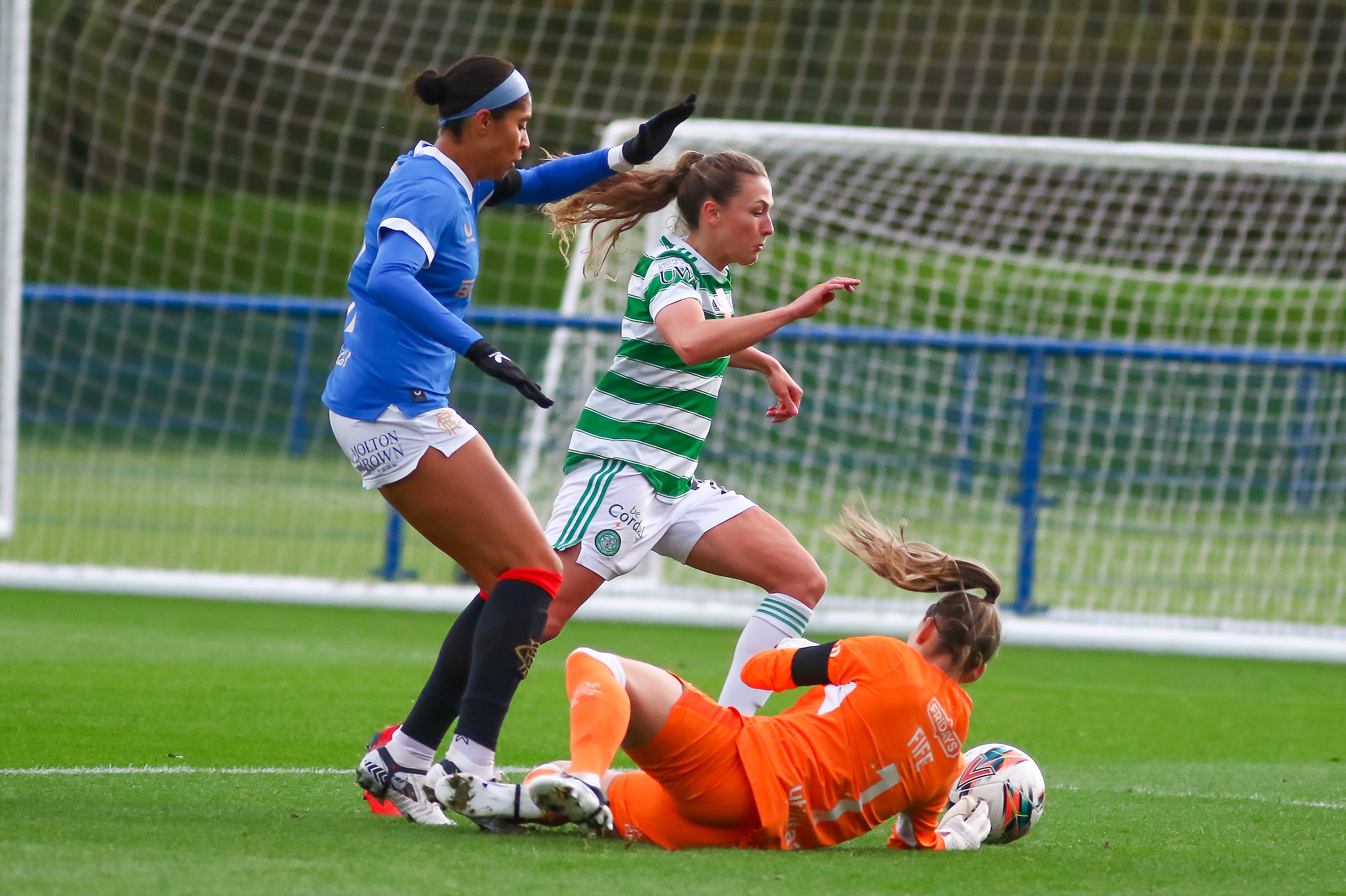 - Jenna Fife (#1) of Rangers Womens FC dives at the feet of the advancing Charlie Wellings (#21) of Celtic Women FC during the Scottish Women’s Premier League Cup quarter-final match between Rangers Women and Celtic Women at Rangers Football Academy, Glasgow, Scotland on 31 October 2021.