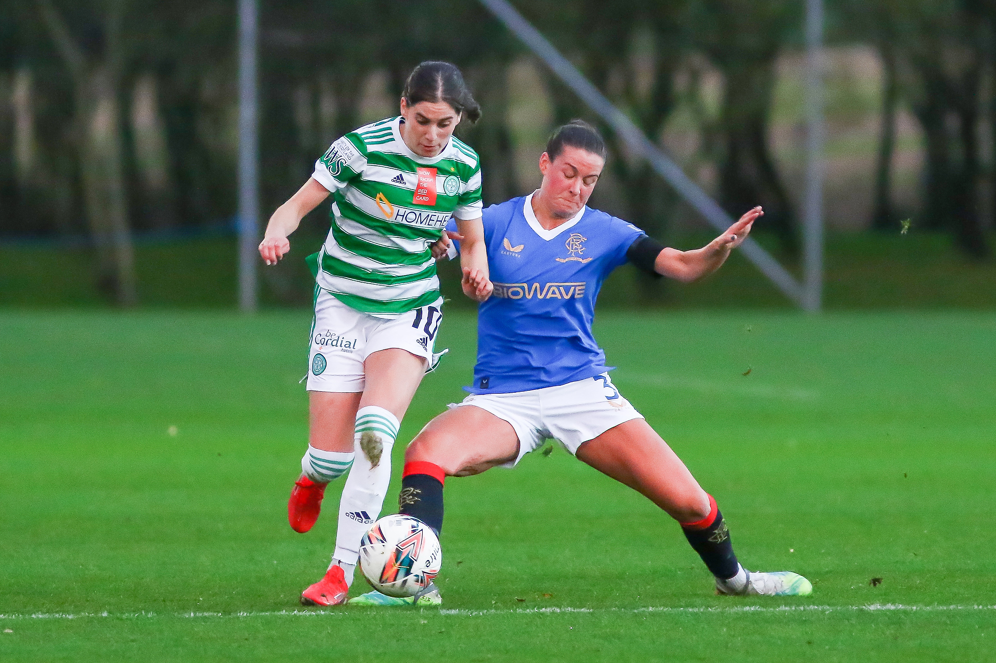 - Jodie Bartle (#3) of Celtic Women FC & Nicola Docherty (#2) of Rangers Womens FC chase a bouncing ball during the Scottish Women’s Premier League Cup quarter-final match between Rangers Women and Celtic Women at Rangers Football Academy, Glasgow, Scotland on 31 October 2021.