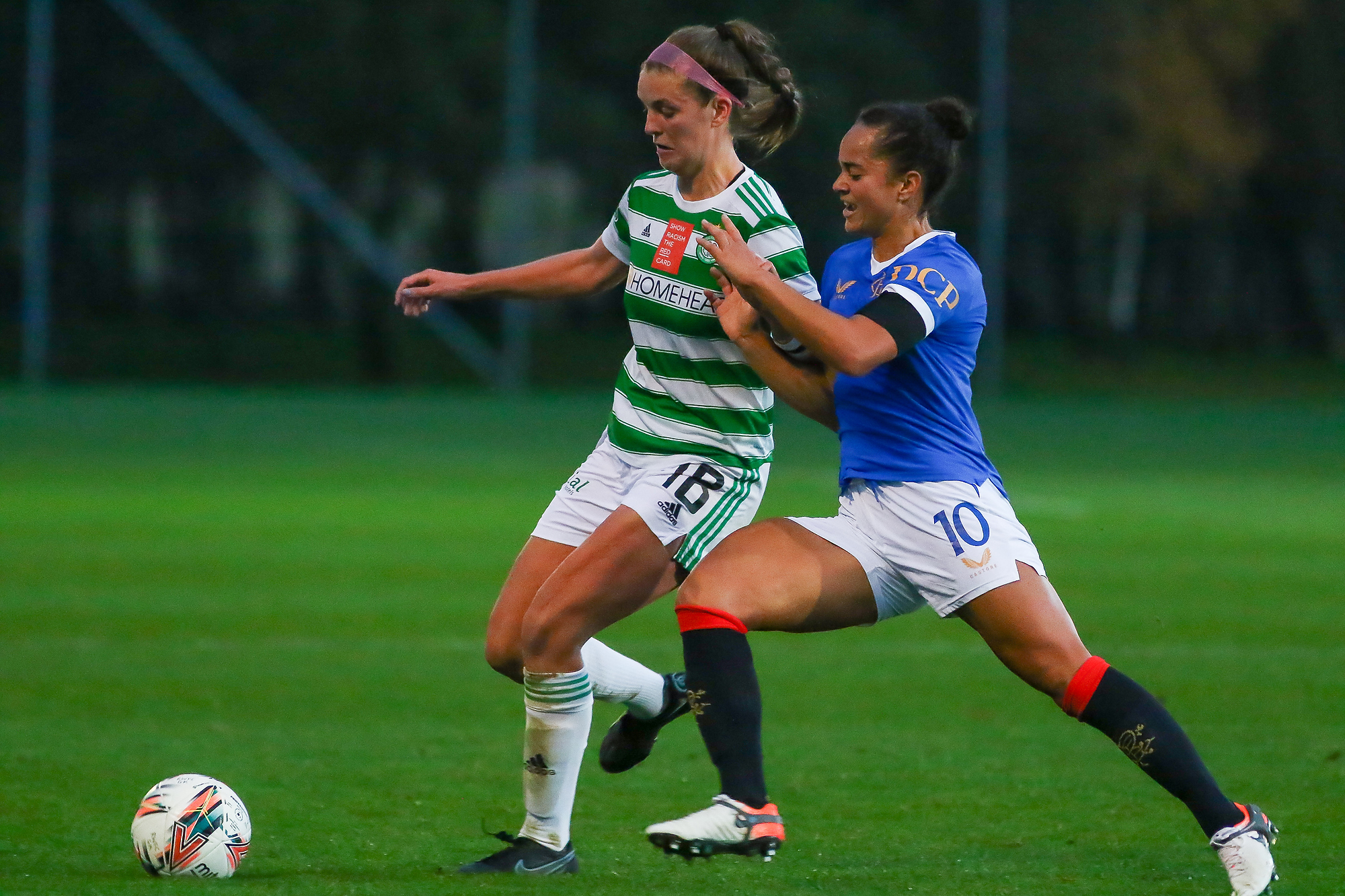 - Kayla McCoy (#10) of Rangers Womens FC challenges Caitlin Hayes (#18) of Celtic Women FC for the ball during the Scottish Women’s Premier League Cup quarter-final match between Rangers Women and Celtic Women at Rangers Football Academy, Glasgow, Scotland on 31 October 2021.