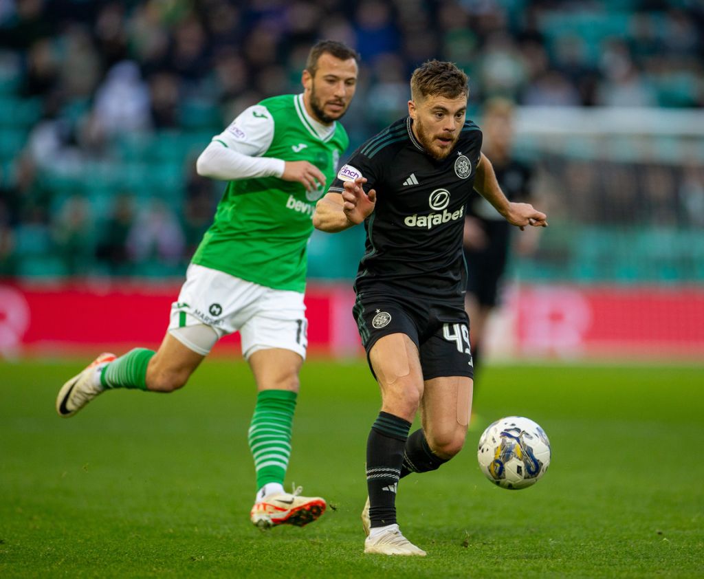 Hibernian v Celtic – Mikey Johnston right and Hibernian s Lewis Miller battle for the ball during the cinch Premiership match at Easter Road on Saturday October 28, 2023. Photo Jane Barlow