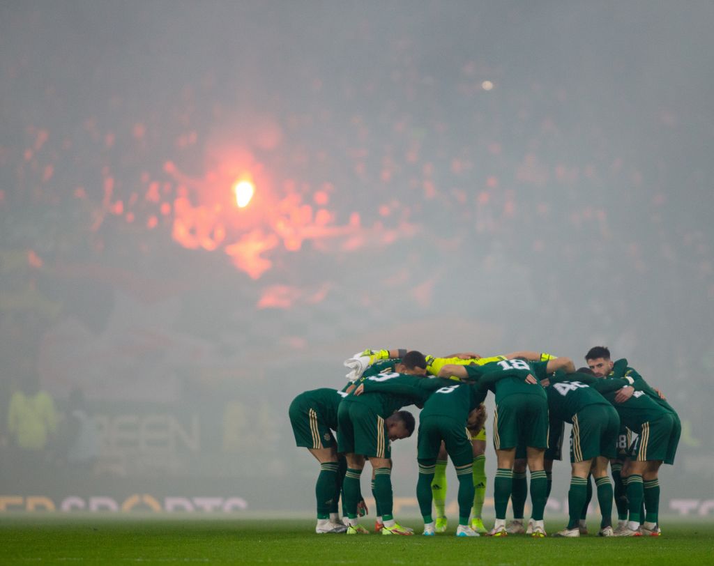 19th December 2021; Hampden Park, Glasgow, Scotland; Scottish League Cup final, Hibernian versus Celtic: Celtic pre match huddle as the stadium fills with smoke and pyro smoke