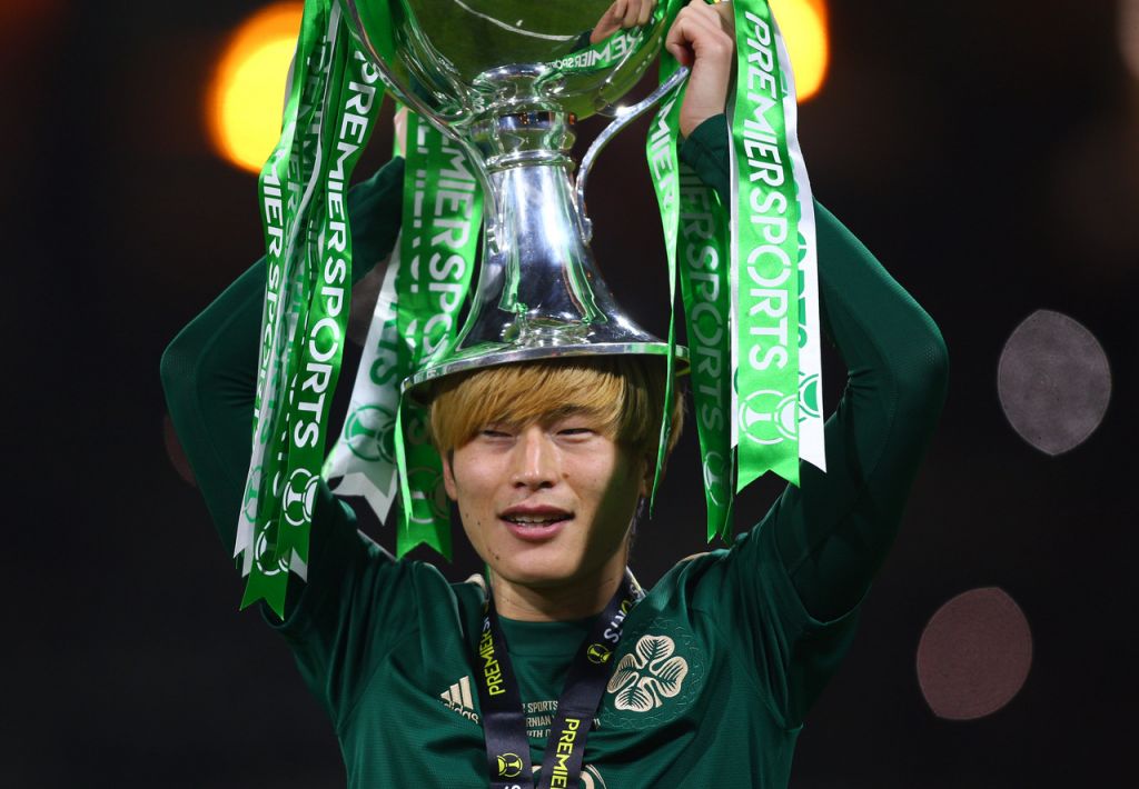 Kyogo Furuhashi of Celtic celebrates with the Premier Sports Cup after victory in the Premier Sports Cup Final between Celtic and Hibernian at Hampden Park on December 19, 2021 in Glasgow, Scotland. (Photo by Ian MacNicol/Getty Images) (Photo by Ian MacNicol/Getty Images)
