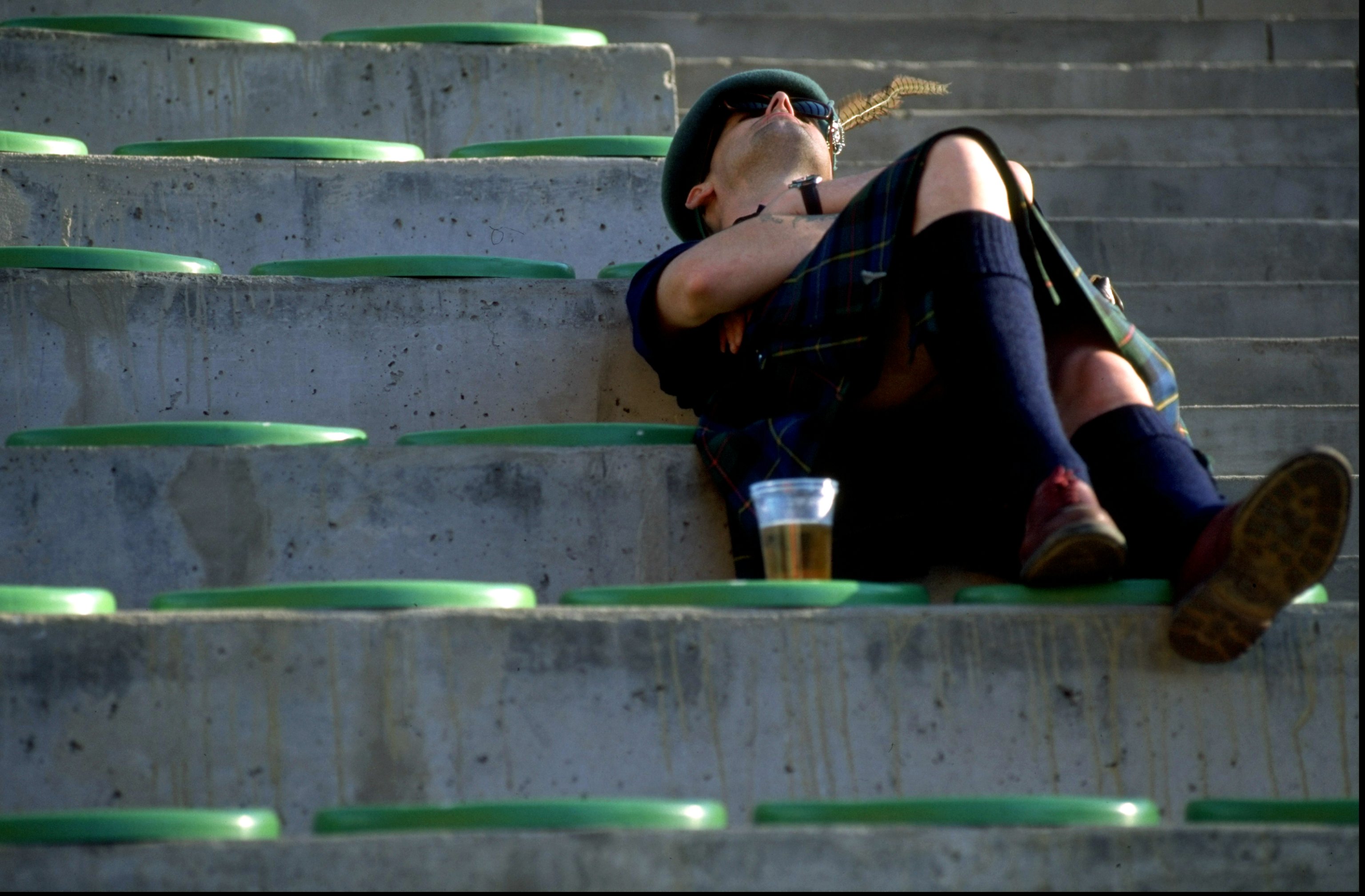 23 June 1998: A Scotland fan catches some sleep before the World Cup group A game against Morocco at the Stade Goeffroy Guichard in St Etienne, France. Scotland lost 3-0. Photo Doug Pensinger /Allsport