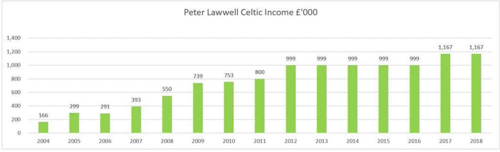 Here’s a tweet from Price of Football from last year – 29 October 2018 – for you to consider…”Since joining Celtic in October 2003 CEO Peter Lawwell has earned £11,320,000 from the club. Pay rose from £166,000 for the period to June 2004 to £1,167,000 last year.”