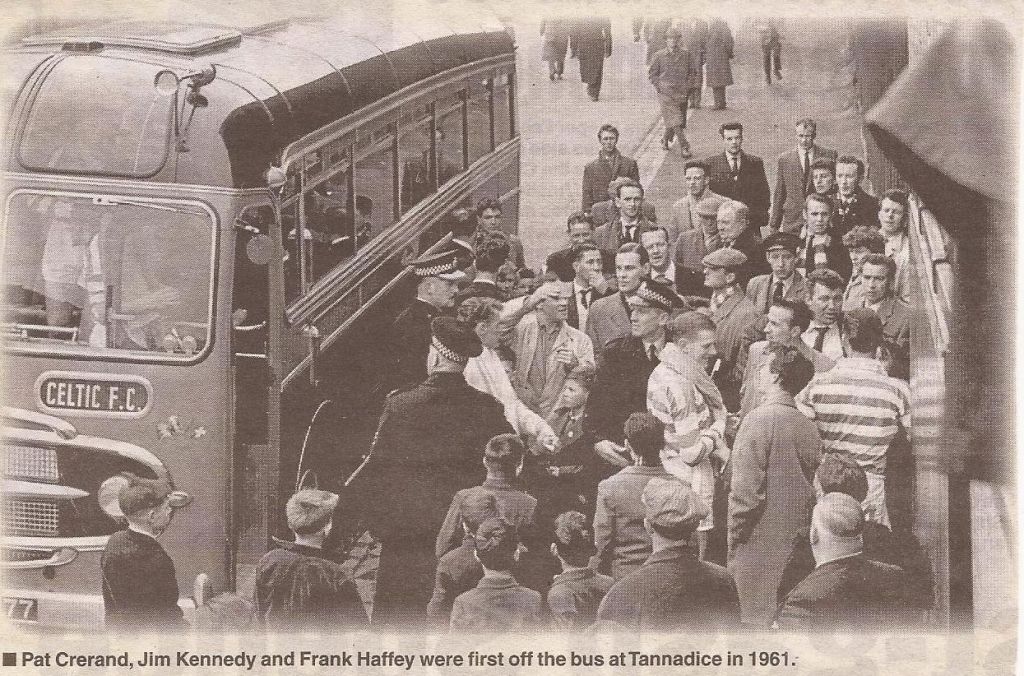 The Bhoys would remain on Tayside that weekend as the next fixture saw them play 200 yards along Tannadice Street just two days later. There is a famous photograph of the team bus rolling up to the stadium with the players emerging already Hooped up, perhaps the work to replace the old main stand the reason behind that scenario.