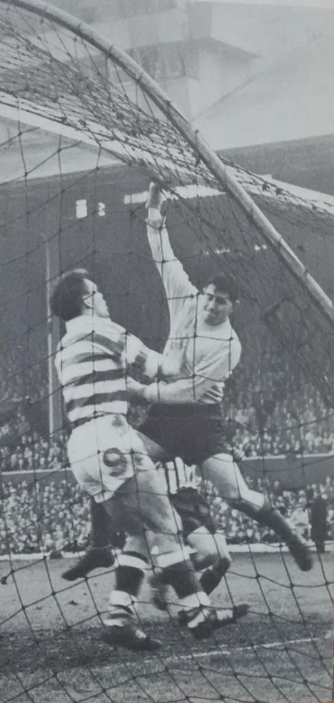 Connachan was again in inspired form, defying the eager Hoops forwards time after time in the first half, as both sides again failed to break the cup final deadlock by the interval. The game turned within a minute midway through the second period. For once, Stevie Chalmers’ shot had beaten the incredible Connachan, only to be handled by a defender, Celtic appeals for a penalty kick waved aside by referee Hugh Phillips.