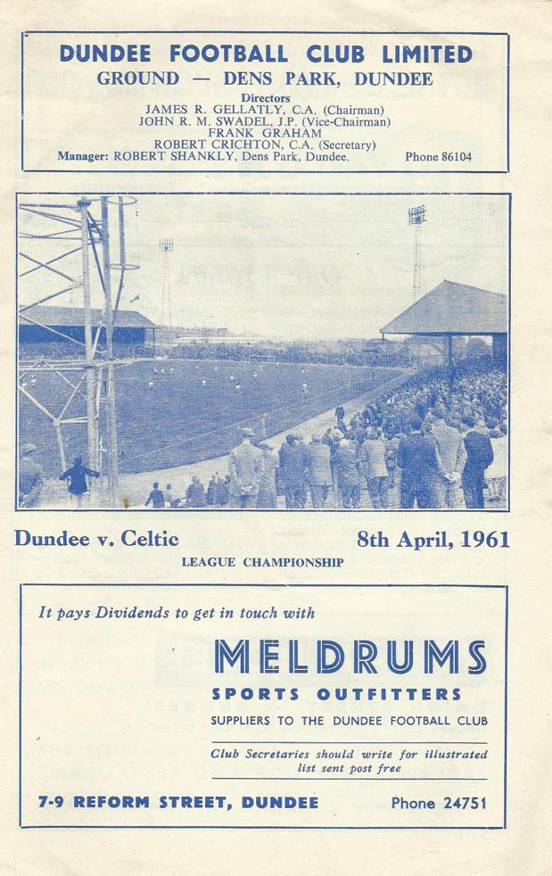 On Saturday, 8 April 1961, it was back to League action as Celts travelled the road and the miles to Dundee for a fixture at Dens Park. The Dark Blues boasted a fine young team who would be Scottish champions within twelve months, including centre-half Ian Ure and striker Alan Gilzean, both of whom would soon earn big-money moves to Manchester United and Tottenham Hotspur respectively, albeit Ure is perhaps better known for his time with Arsenal. A tight game was settled by one mistake after half an hour’s play, Alex Hamilton’s passback to Pat Liney evading the home keeper, allowing Stevie Chalmers the easiest goal of his career.