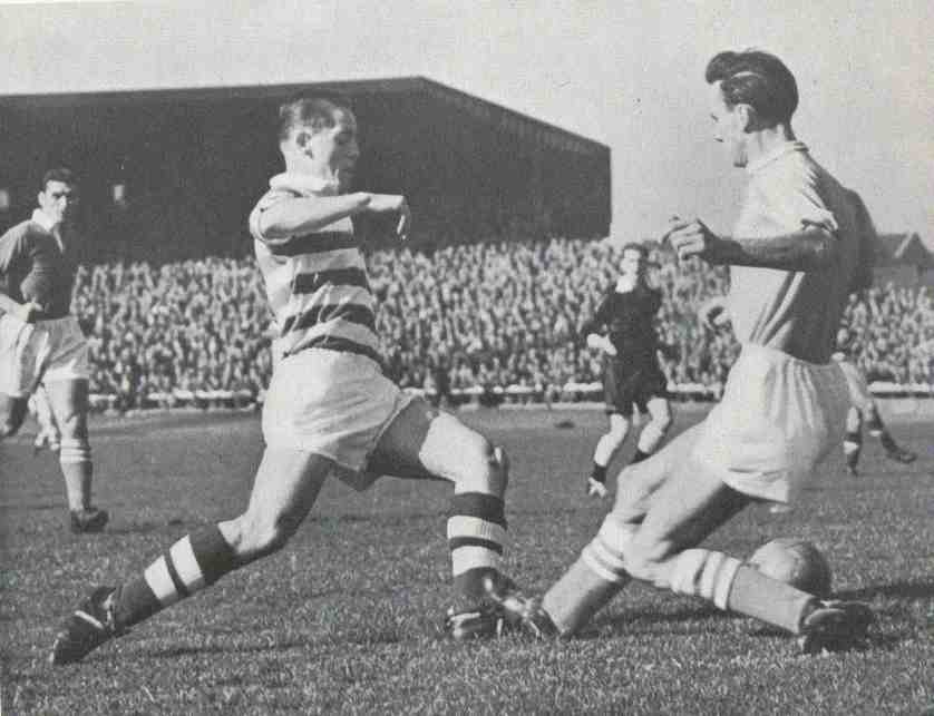 Celts returned to Kirkcaldy seven days later, scene of their opening-day League Cup defeat. Steve Chalmers returned from injury to make his second appearance in the Hoops, wide on the right flank, whilst Neil Mochan was up against his brother Denis, in the left-back role. Jim Baxter was at left-half for Raith rovers. Mike Jackson gave the Bhoys the lead on 20 minutes with a deflected shot, however, the day would belong to former Ashfield man, Chalmers. Six minutes into the second half, he opened his Celtic account with a blistering finish, having been sent clear by Jackson. And with 8 minutes remaining, he took advantage of a slip by home keeper Drummond to grab his second and Celtic’s third, sealing a 3-0 victory.