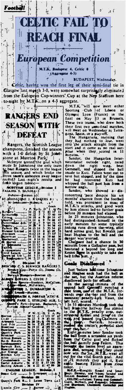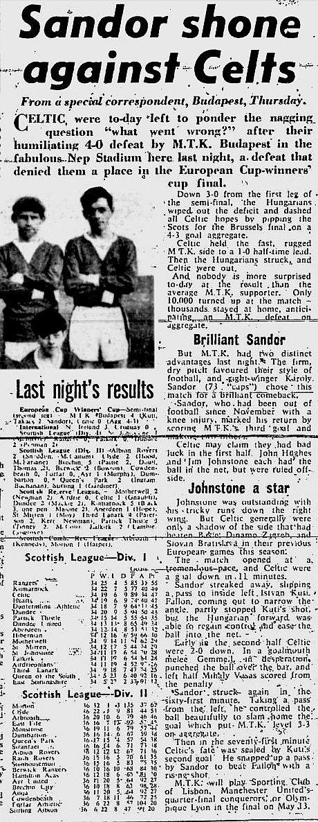 Forty years after that tragic afternoon in the Nepstadion, a Henrik Larsson-inspired Hoops side would return to Budapest to avenge that defeat, beating MTK by the same 4-0 margin in a Champions League qualifier. However, back in April 1964, it was a sad Celtic party who flew home to Glasgow, embarrassed, humiliated and dejected. Lessons would need to be learned from the top down at Parkhead if that European dream was ever going to be fulfilled.