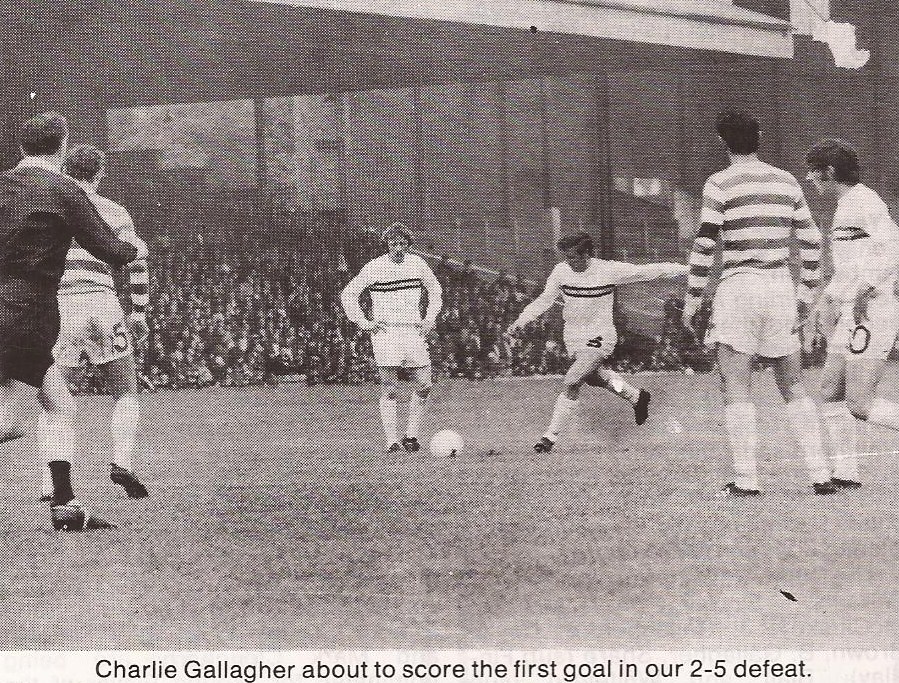 Dumbarton’s game at Celtic Park was played on 31 July 1971, and Celtic Park was a strange sight with the main stand still out of commission as it was being redeveloped. Pre-season Micky Mouse tournament or not, the Dryburgh Cup persuaded 22,000 to appear and Charlie was given a great reception by the crowd as Dumbarton came out. It was however another Charlie who was the main focus of attention, for the great Charlie Tully had died a few days previously in Belfast and was given a very impressive minute’s silence. Gallagher had of course known Tully, for their careers had crossed briefly in the late 1950s.