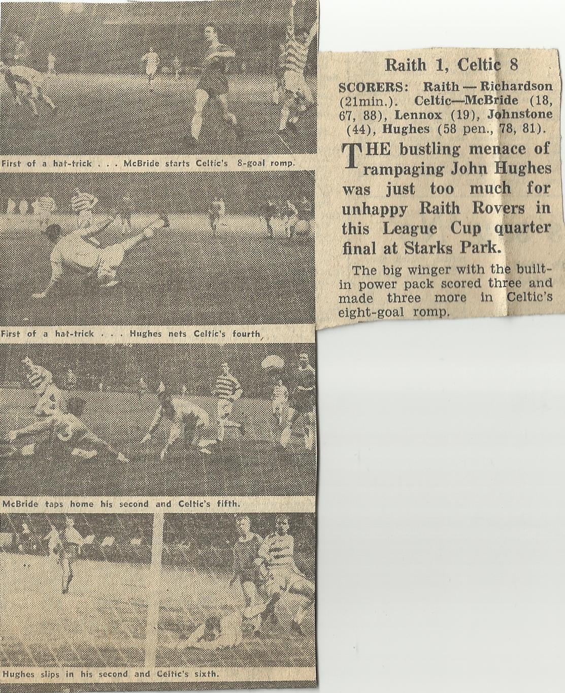Charlie’s next first team game was at Stark’s Park, Kirkcaldy in the first leg of the Scottish League Cup quarter final. It was a real thumping for the locals who were mesmerised by the sheer power of the Celtic forward line. Celtic were well served by the guile of Gallagher as they won 8-1 against a Raith Rovers team, now in the Second Division and who had seen better days.