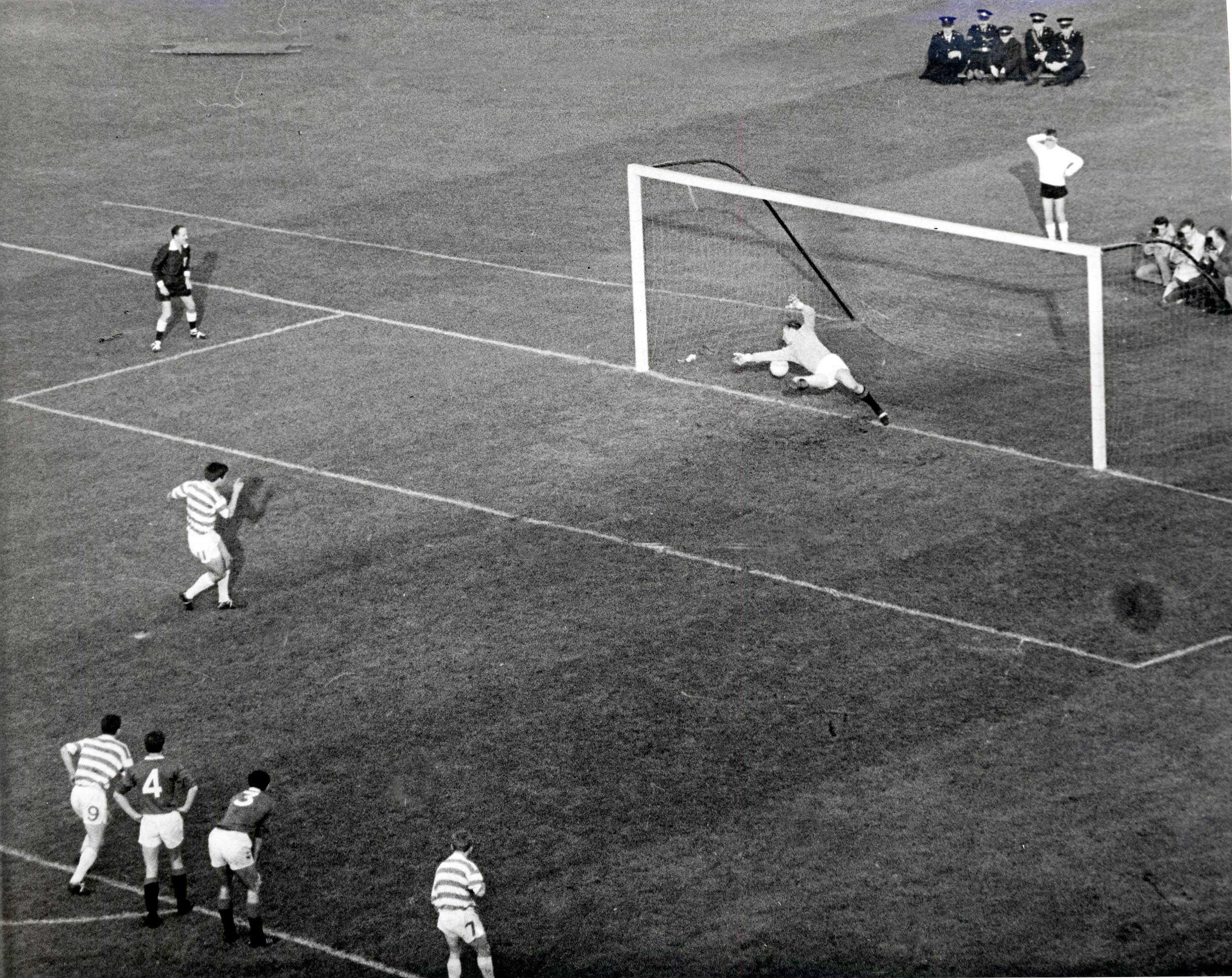 Up stepped the lumbering, occasionally temperamental figure of John Hughes. (According to his own admission, Hughes had taken the field that day praying that there would not be a penalty kick which would require his services) Behind the goal at the Celtic End, 50,000 fans held their breath, but John slotted the ball home. Celtic were now one up, and the defence which had been hesitant before suddenly gained confidence, McNeill in particular winning everything in the air.
