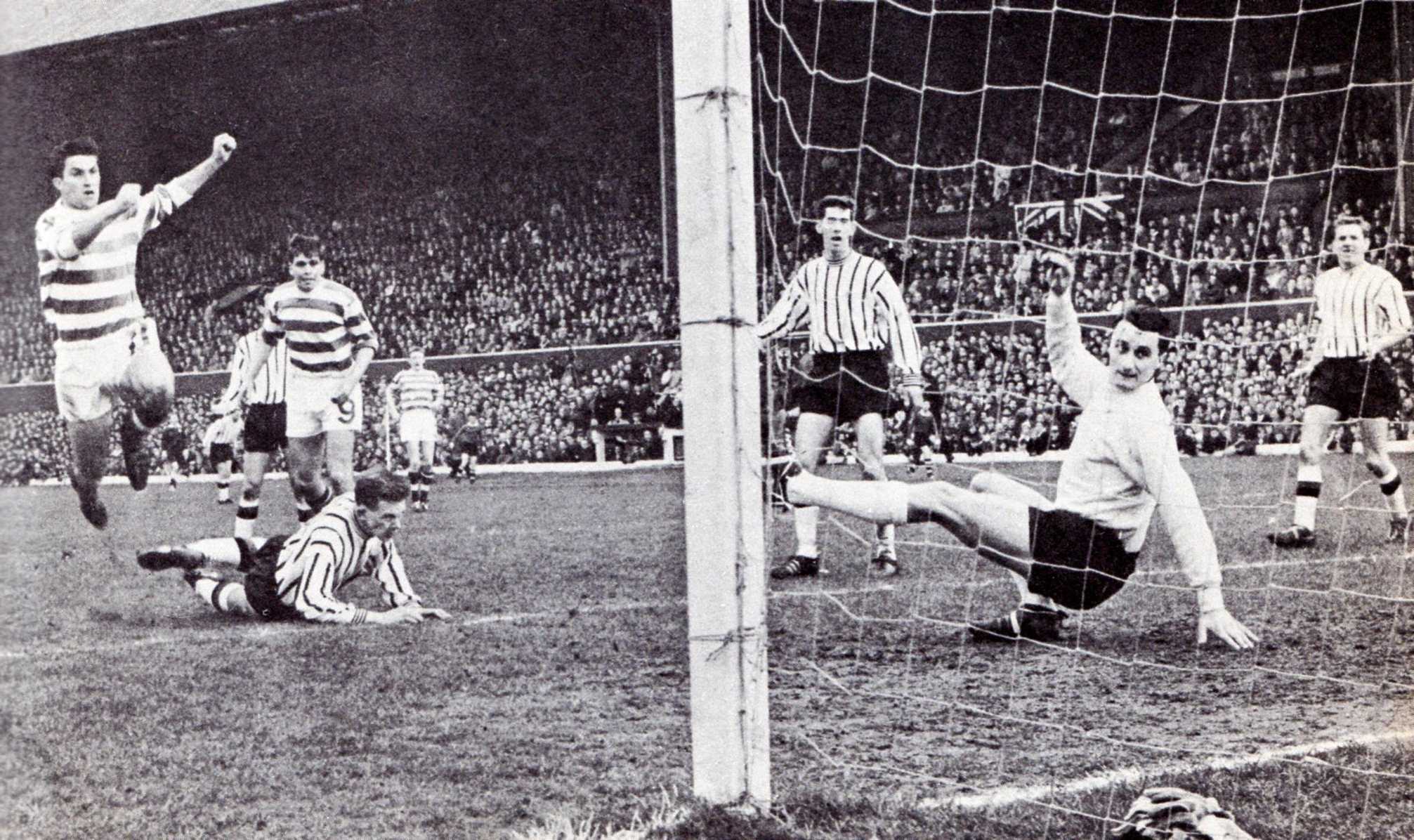 to expectation when it was seen that the ball did not go over the bar, or even bounce back into play but in fact rose straight UP in the air, and not only that, but Bertie Auld was rushing in to head the ball in when it came down!