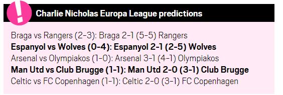 His predicted result from Portugal would also be particularly crushing for Steven Gerrard across the city. They did produce a great comeback last week, but you have to think letting Celtic extend their lead and crashing out of Europe would be a particularly tough one to take.