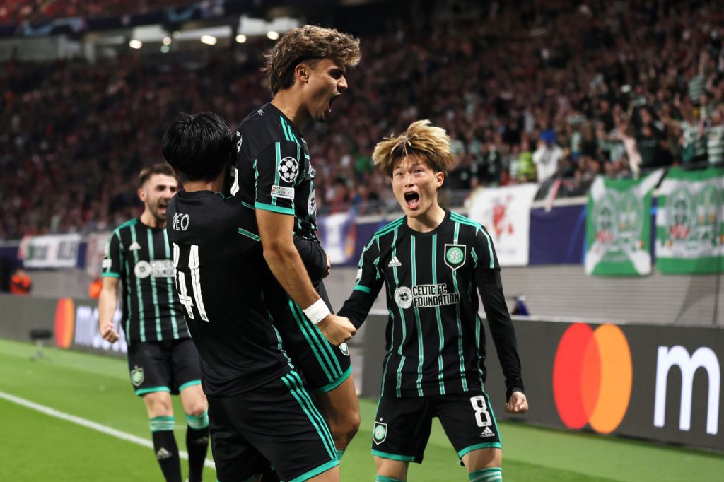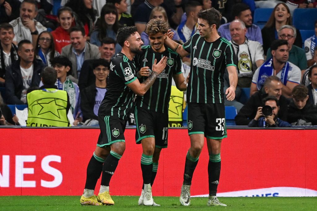 Celtic’s Portuguese midfielder Joao Pedro Neves Filipe (C) celebrates with teammates after scoring his team’s first goal during the UEFA Champions League 1st round day 6 Group F football match between Real Madrid CF and Celtic FC at the Santiago Bernabeu stadium in Madrid on November 2, 2022. (Photo by PIERRE-PHILIPPE MARCOU / AFP) (Photo by PIERRE-PHILIPPE MARCOU/AFP via Getty Images)