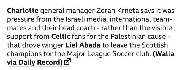 Eventually a solution found with when MLS side Charlotte agreed a deal worth around £8m to take Abada to the States. Now now Charlotte’s general manager Zoran Krneta has confirmed that Abada’s departure was NOT related to the Green Brigade flying of Palestine flags at matches.