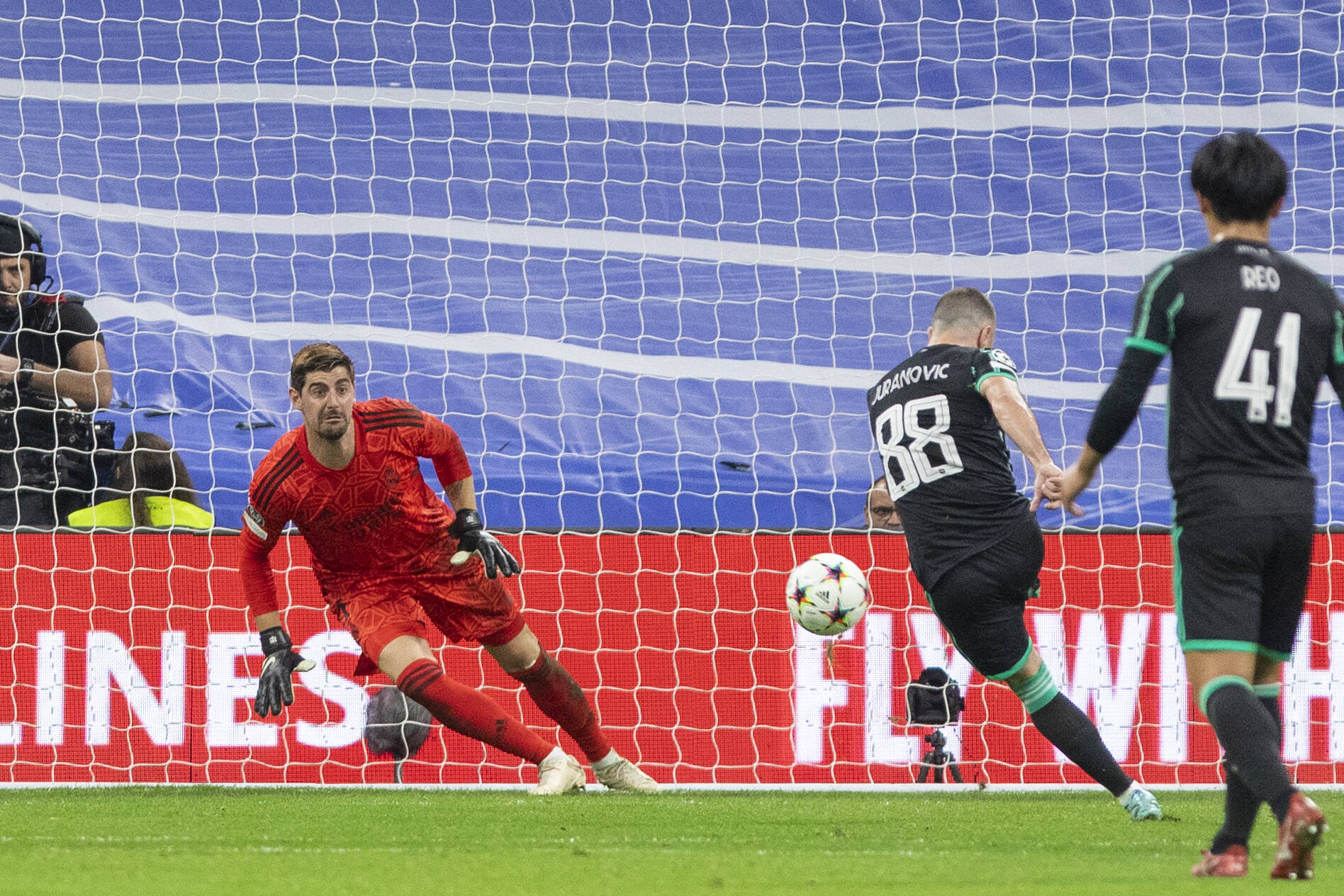 Josip Juranovic of Celtic FC in action with Thibaut Courtois of Real Madrid during the UEFA Champions League match between Real Madrid and Celtic FC at the Estadio Santiago Bernabeu in Madrid,Photo Apo Caballero