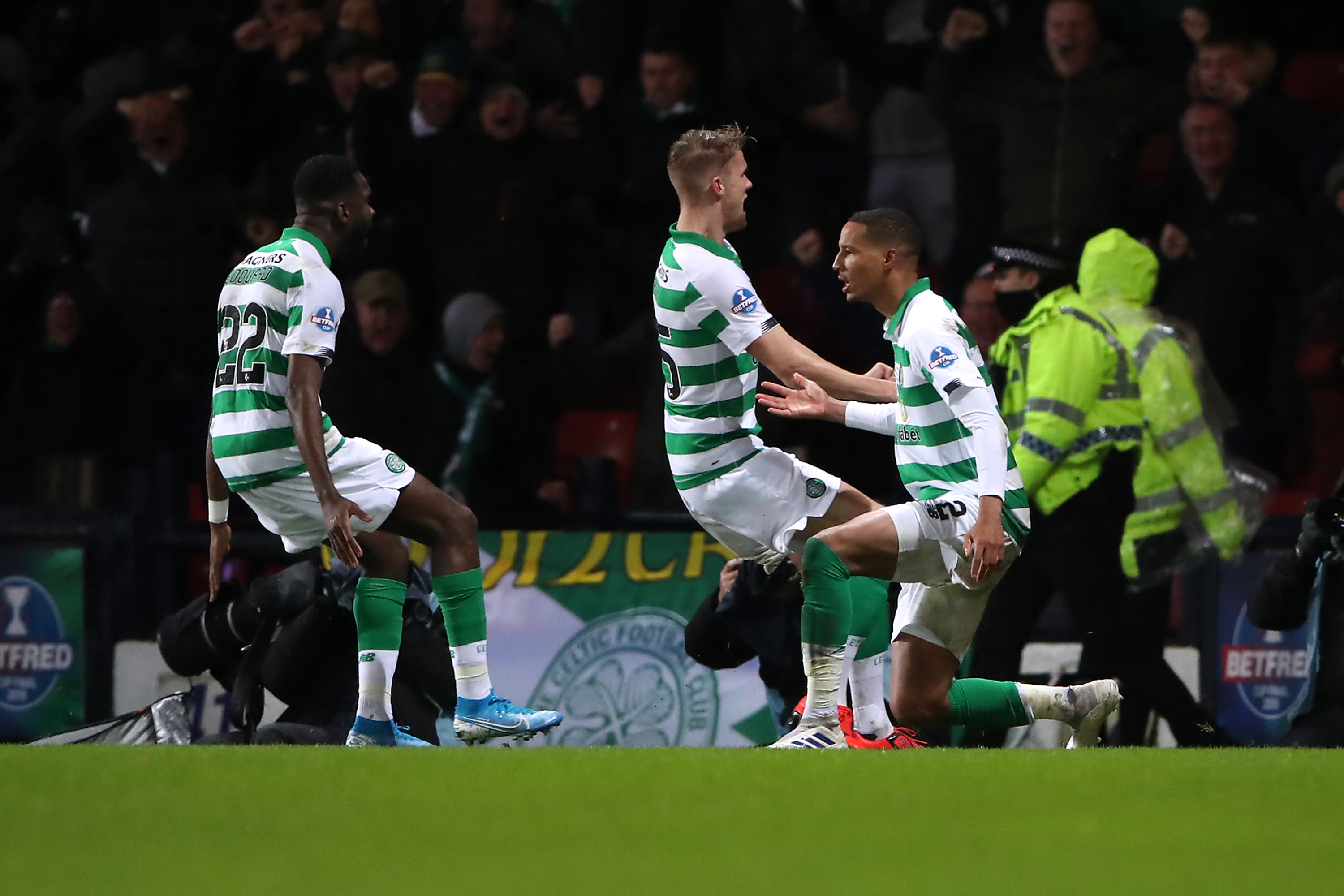 Jullien celebrates his goal against Rangers to start the quadruple treble chase… (Photo by Ian MacNicol/Getty Images)