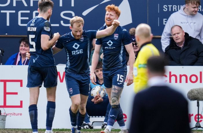 Josh Sims of Ross County celebrates with team mates Jack Baldwin and Simon Murray of Ross County after scoring to give Ross County a 3-1 lead. Photo Stuart Wallace/Shutterstock