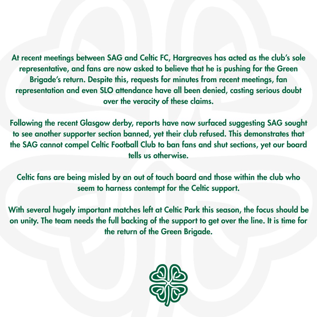 “At recent meetings between SAG and Celtic FC, Hargreaves has acted as the club’s sole representative, and fans are now asked to believe that he is pushing for the Green Brigade’s return. Despite this, requests for minutes from recent meetings, fan representation and even SLO attendance have all been denied, casting serious doubt over the veracity of these claims.