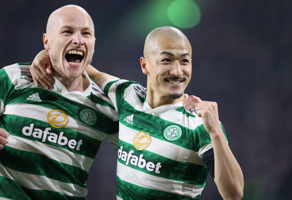 Kyogo Furuhashi of Celtic celebrates after scoring the team’s third goal during the Cinch Scottish Premiership match between Celtic FC and St. Mirren FC at Celtic Park on January 18, 2023 (Photo by Ian MacNicol/Getty Images)