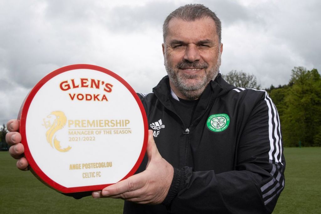 GLASGOW, SCOTLAND – MAY 06: Ange Postecoglou with the Glen’s manager of the season award at Lennoxtown, on May 06, 2022, in Glasgow, Scotland. (Photo by Craig Williamson / SNS Group) (GLASGOW, SCOTLAND – MAY 06: Ange Postecoglou with the Glen’s manage