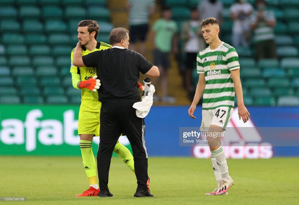 Ange Postecoglou with Vasilis Barkas and Dane Murray of Celtic after the during the UEFA Champions League Second Qualifying Round First Leg between Celtic and FC Midtjylland at Celtic Park on July 20, 2021.(Photo by Steve Welsh/Getty Images)