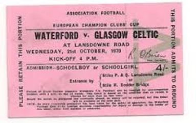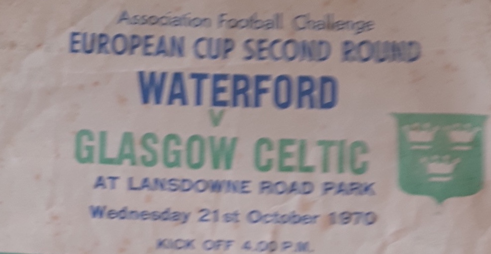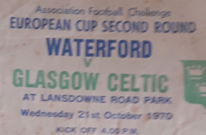 Just a couple of points on Waterford v Celtic game in 1970 sad to say the trouble was caused by mainly Celtic fans from Scotland and Northern Ireland fighting with each other. The game as a contest was effectively over after half an hour and behind the goal at the Landsdowne Road end where Celtic fans had congregated fighting broke out which was a sad reflection on both elements of our support.