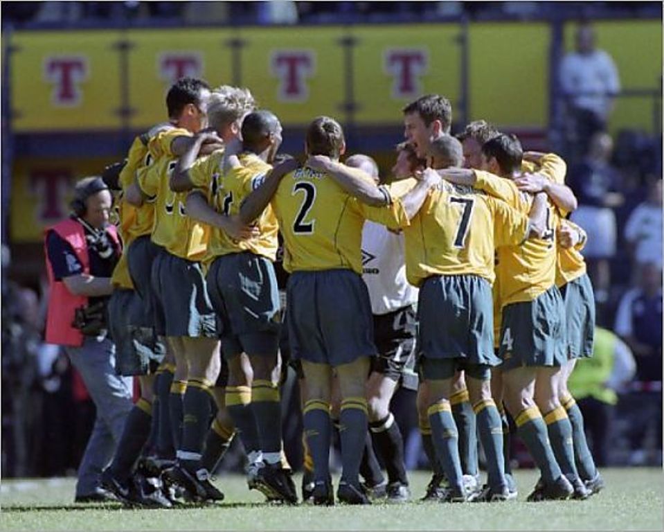 This game won Celtic’s 31st Scottish Cup and sealed their third treble to join 1967 and 1969. Hibs too had had a reasonable season but today they were well beaten by Celtic for whom Henrik Larsson scored twice and Jackie McNamara once. Celtic wore yellow but changed into green and white to receive the trophy.