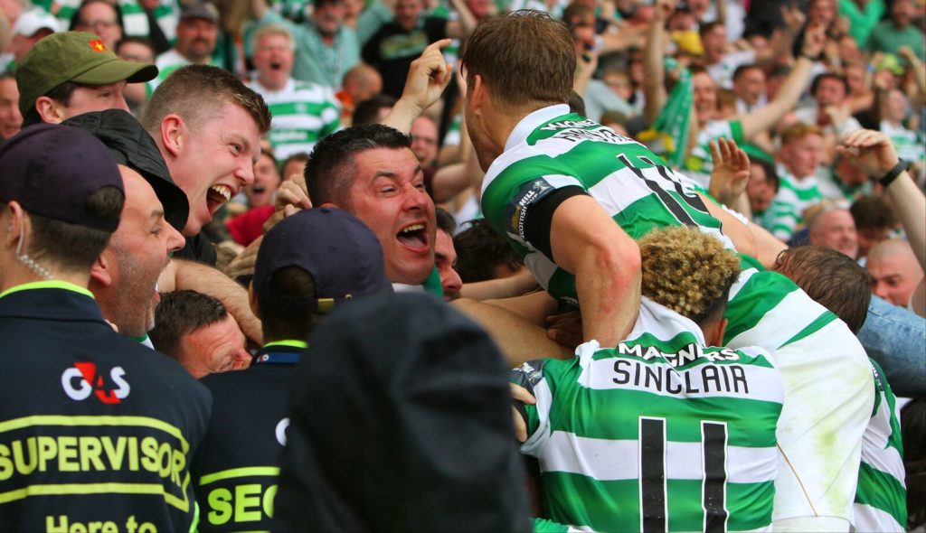The second half saw an epic struggle with Celtic gradually gaining the ascendancy until late in the game when Tommy Rogic ran through and scored a great goal which saw the Celtic End at Hampden explode with joy. Kieran Tierney who had been taken off with a broken jaw was back in time to take part in the celebrations!