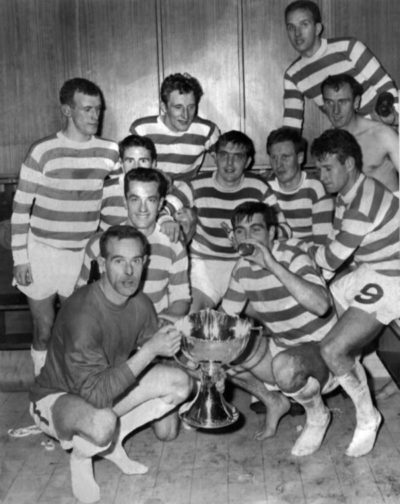 It so happened that it didn’t decide the League, for a now dispirited, outmaneuvered and disorganised Rangers managed to lose to Aberdeen, a team which had improved over the last few months. For a long time, it was a draw at Ibrox, but the Dons scored late, and just about the same time as the Cup was being presented to the Pars, it was confirmed that Rangers had lost and that Celtic, unless they lost 16-0 to Dunfermline on Wednesday night, were the champions. Legend had it that Stein nearly broke his ankle jumping for joy when he heard. It was certainly a very sweet moment for him, the team and all Celtic supporters.