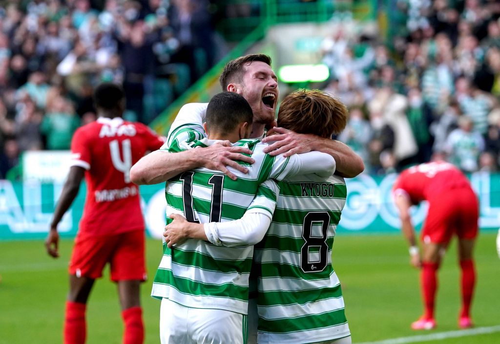 Kyogo Furuhashi celebrates scoring the opening gaol against AZ Alkmaar. Photo Andrew Milligan