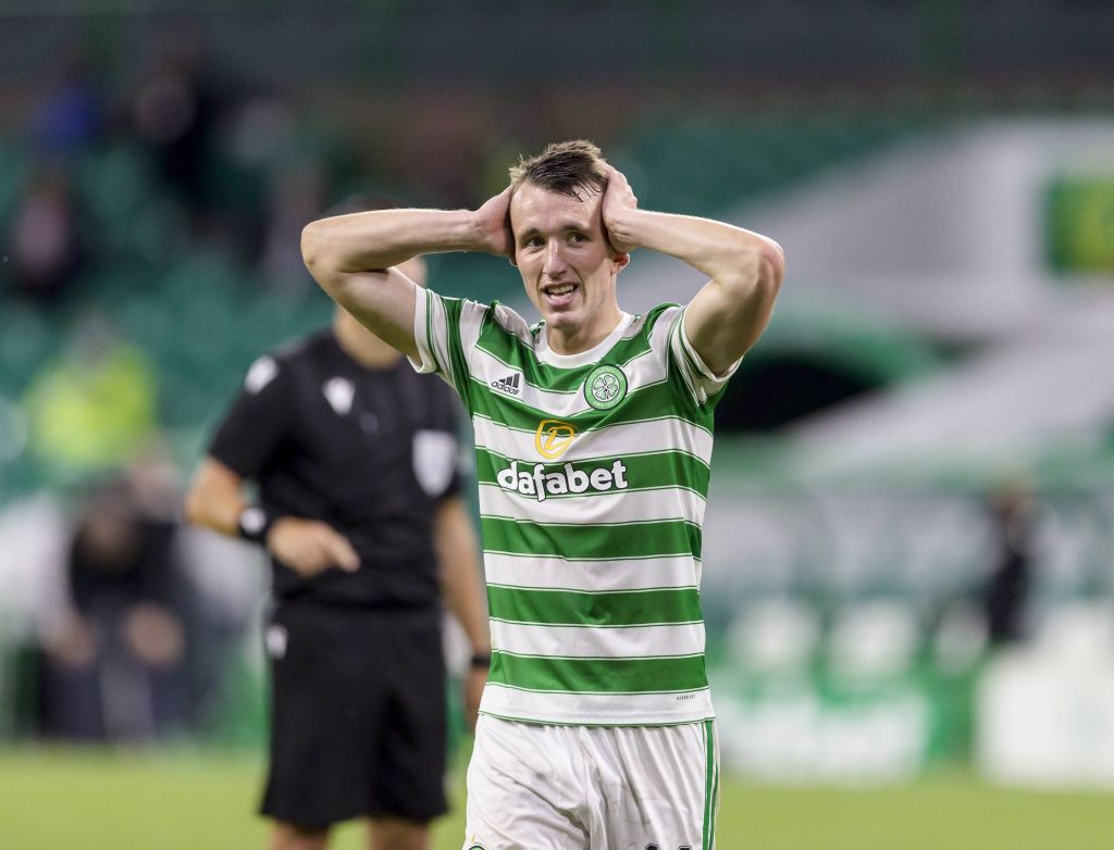 David Turnbull rues a missed chance during the Europa League play off first leg match at Celtic Park, Glasgow Photo by MB Media