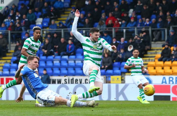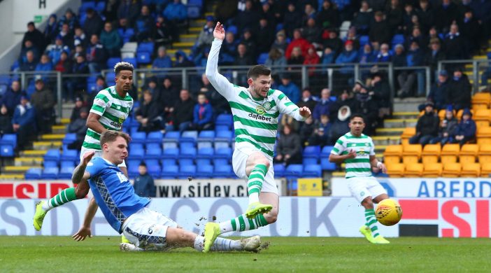 Tommy Wright set up his side to frustrate Celtic and for the first half he certainly succeeded in doing just that, with Clark looking as reliable as ever in the home side’s goals. Indeed it was Bain who was called into action in the early stages, when with Celtic down to ten men with Ajer off getting treatment for a head-knock, former Celtic star Tony Watt put Kennedy through but Bain made the save.