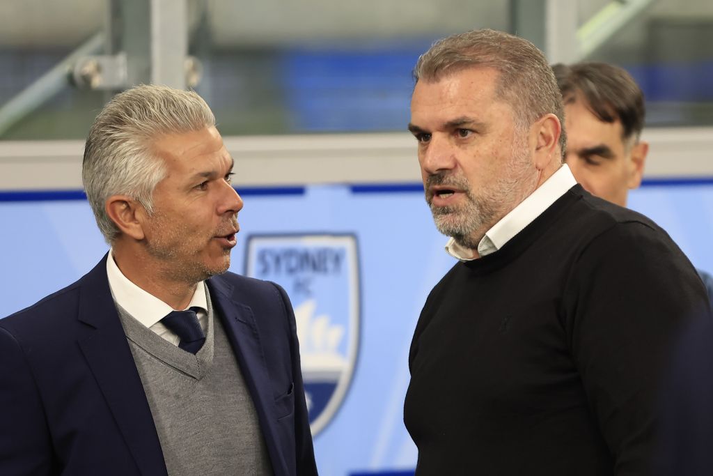 Steve Corica, coach of Sydney FC greets Ange Postecoglou manager of Celtic before the Sydney Super Cup match between Celtic and Sydney FC at Allianz Stadium on November 17, 2022 in Sydney, Australia. (Photo by Mark Evans/Getty Images)